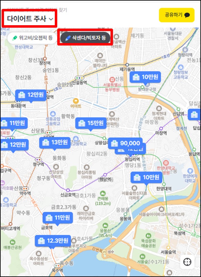 나만의닥터 삭센다 가격 지도로 이동한 후에는 위쪽의 메뉴들 중에서 [다이어트주사]와 [삭센다/빅토자 등]을 선택한 후 지도의 위치를 이동하면 내 동네 근처에서 삭센다 1펜을 저렴하게 판매하는 곳을 쉽게 확인할 수 있습니다.